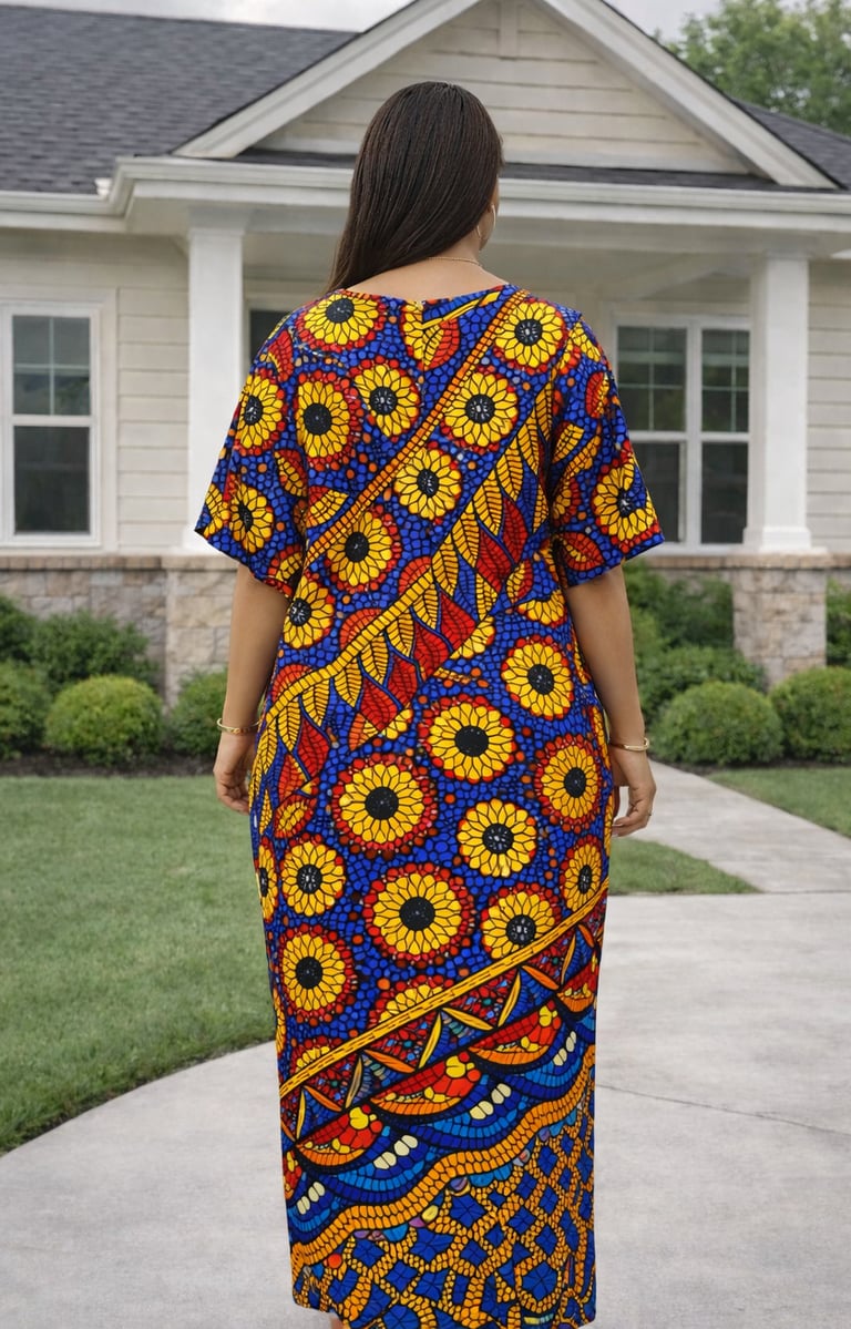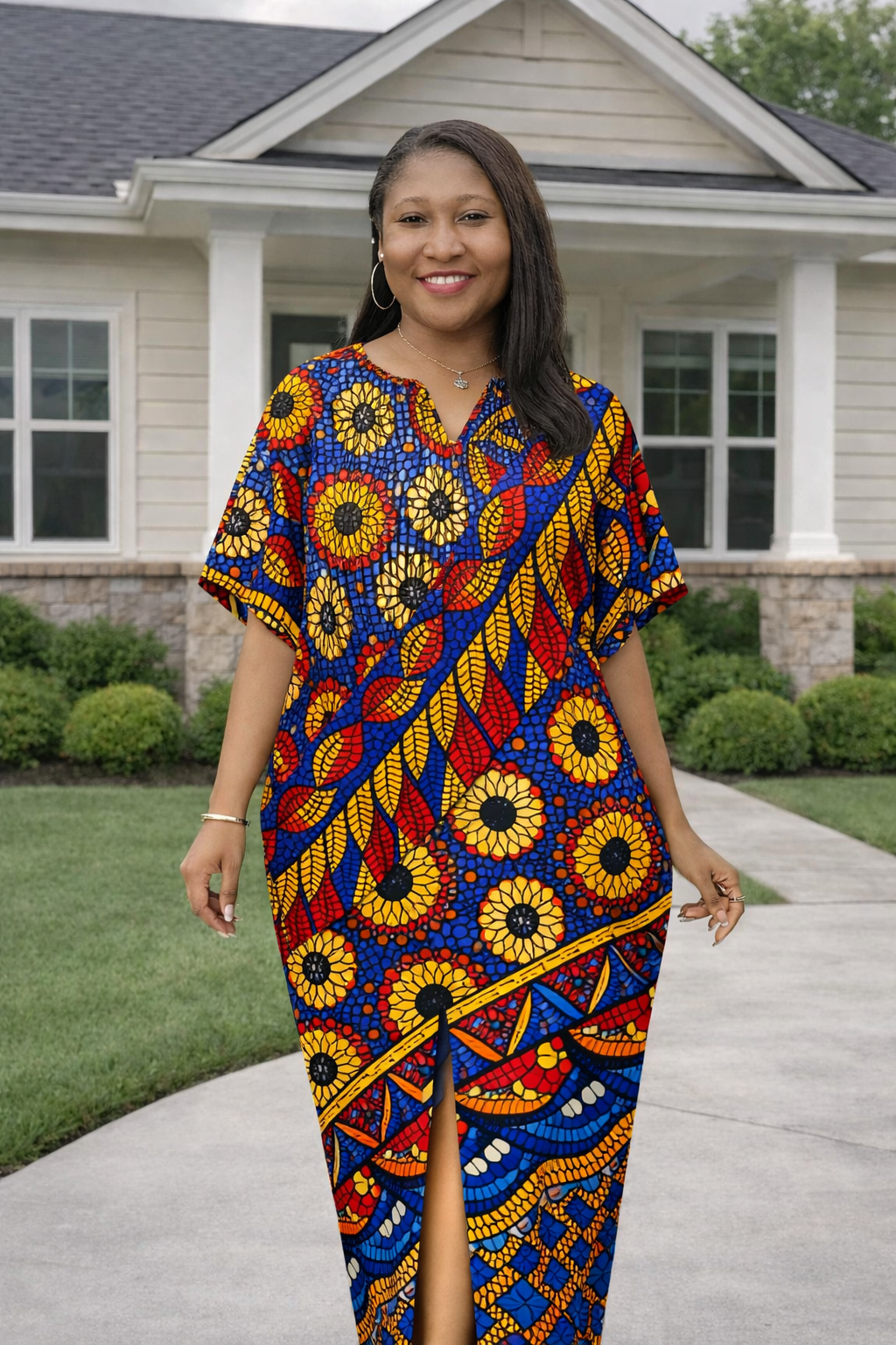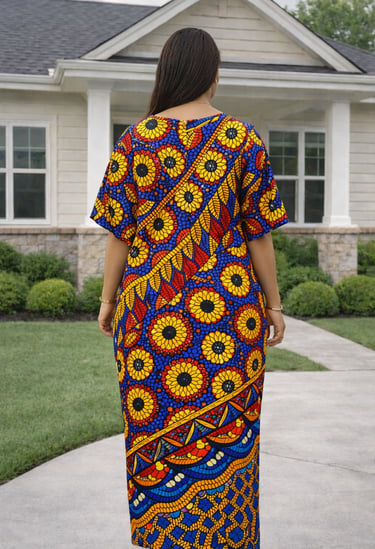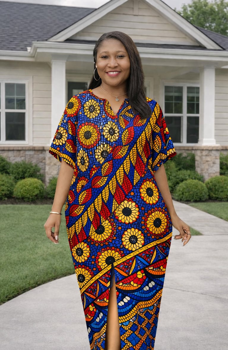 This is a loose-fitting, straight-cut Ankara maxi gown designed for comfort and elegance. The gown has a relaxed silhouette that falls freely from the shoulders down to the ankles without clinging to the body. It is made from vibrant Ankara fabric featuring bold floral and geometric patterns in rich colors.